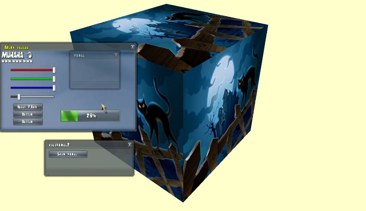 • saját GUI (ablakok, panelek, feliratok, gombok, csúszkák, progress bar)